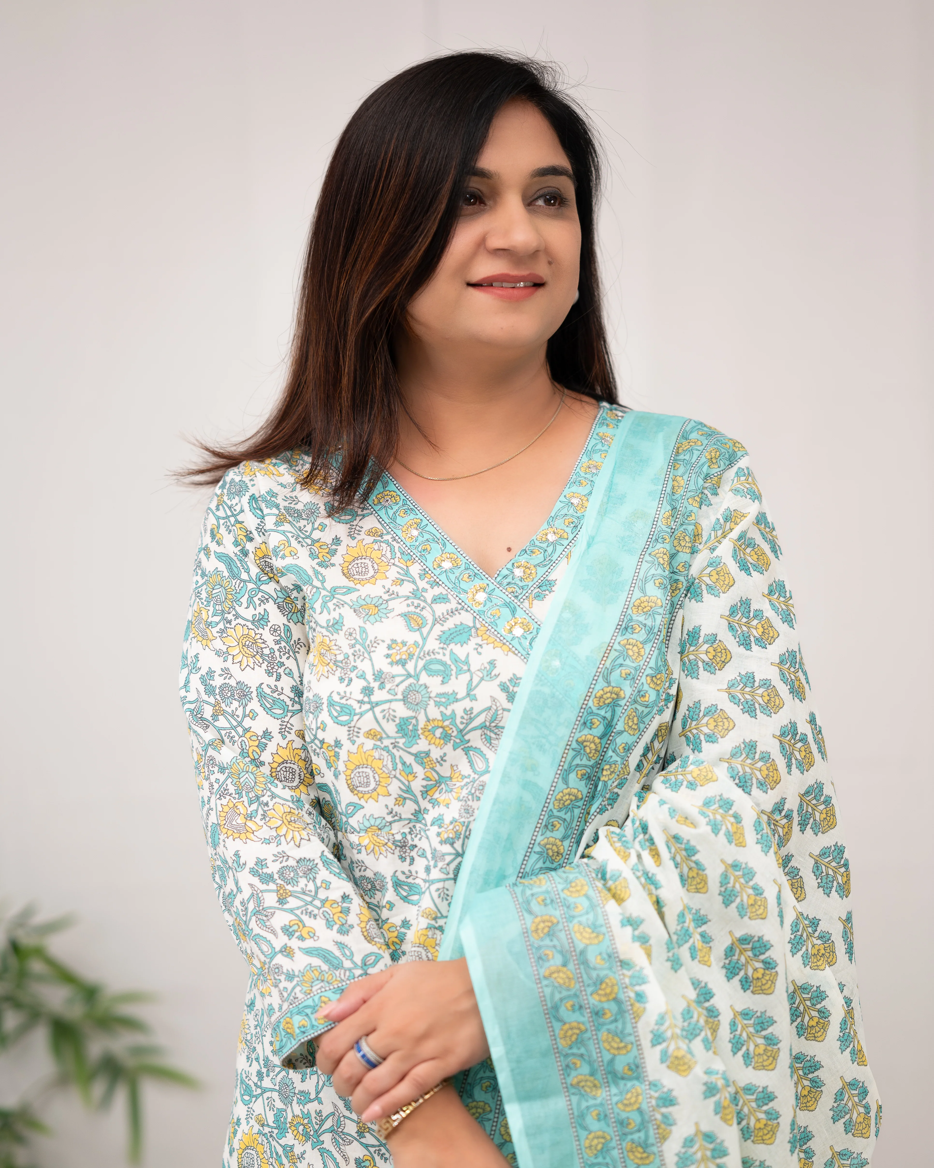 Introducing the Agrakha handblock Print Front Slit Anarkali Pant Set, the perfect blend of tradition and style. Featuring a stunning angrakha pattern and crafted from soft cotton, this set is both comfortable and elegant. Complete the look with the matching pant and dupatta for a timeless and sophisticated ensemble.
