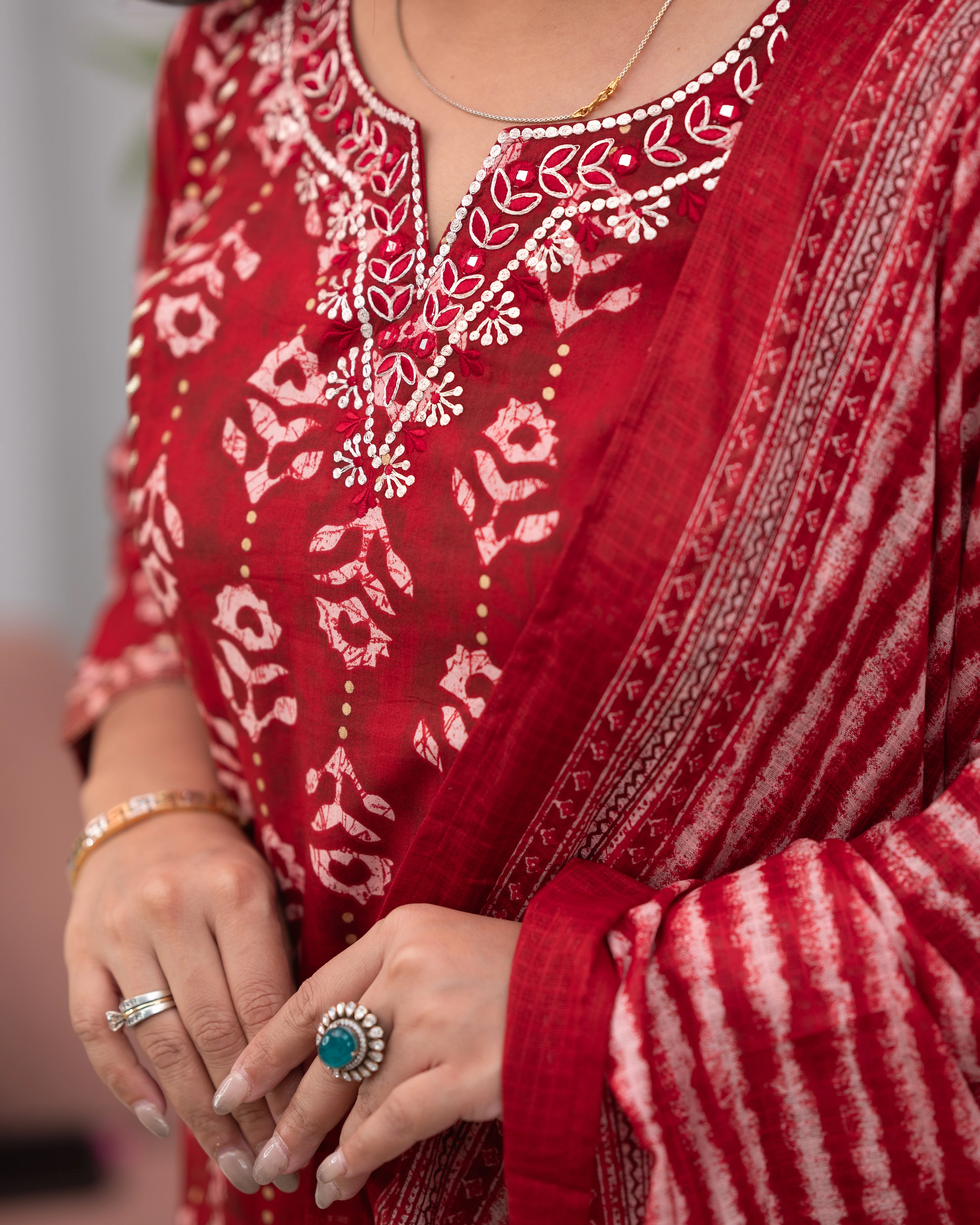 Delight in the comfort of our casual pant-set, tailored from authentic Jaipuri cotton. The neckline is graced with intricate Zari embroidery, offering a shimmering contrast to the soft cotton backdrop. Perfect for the discerning woman who seeks a touch of opulence in her daily attire, this ensemble melds traditional craftsmanship with contemporary comfort. Step out with understated grandeur, every day.