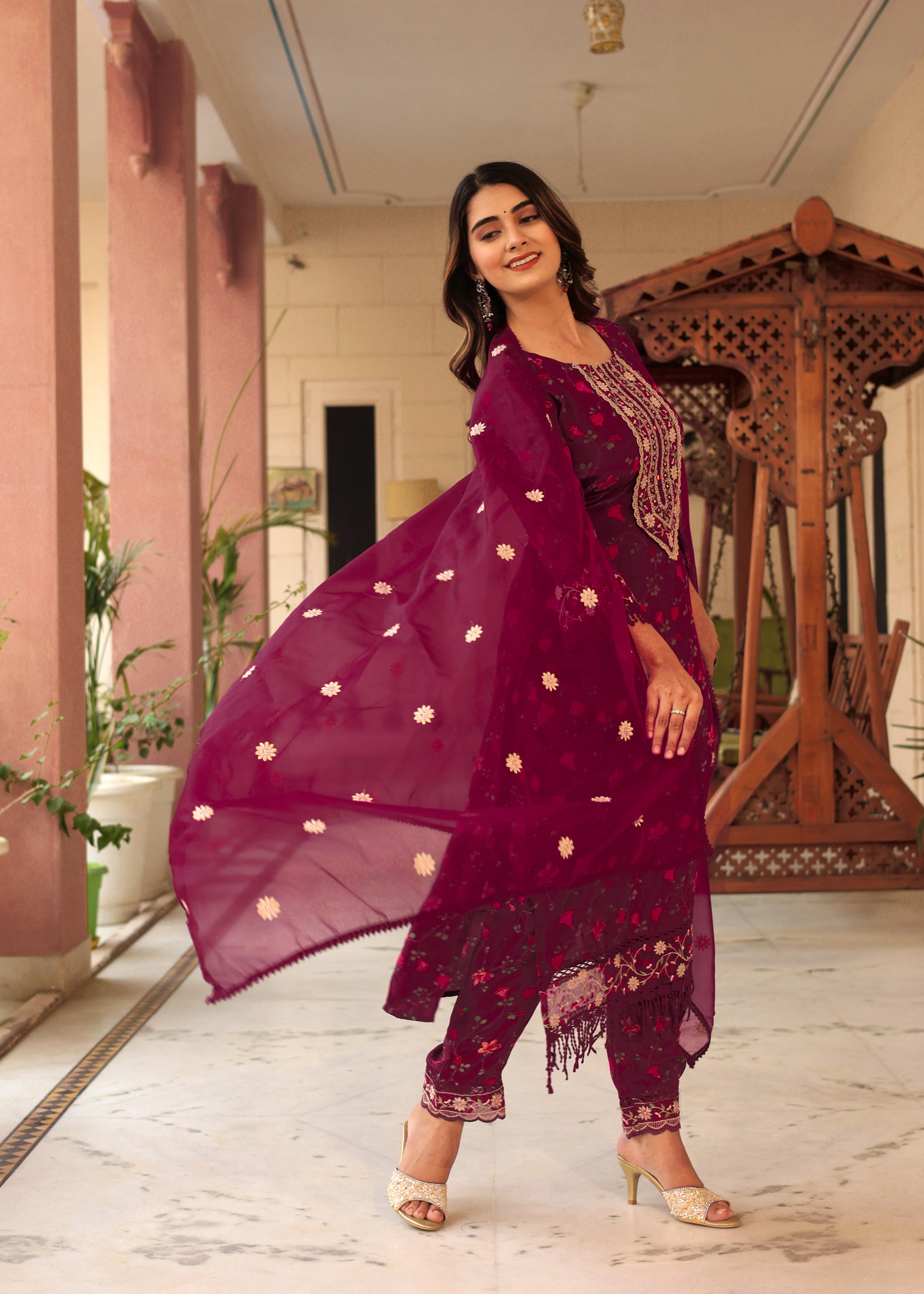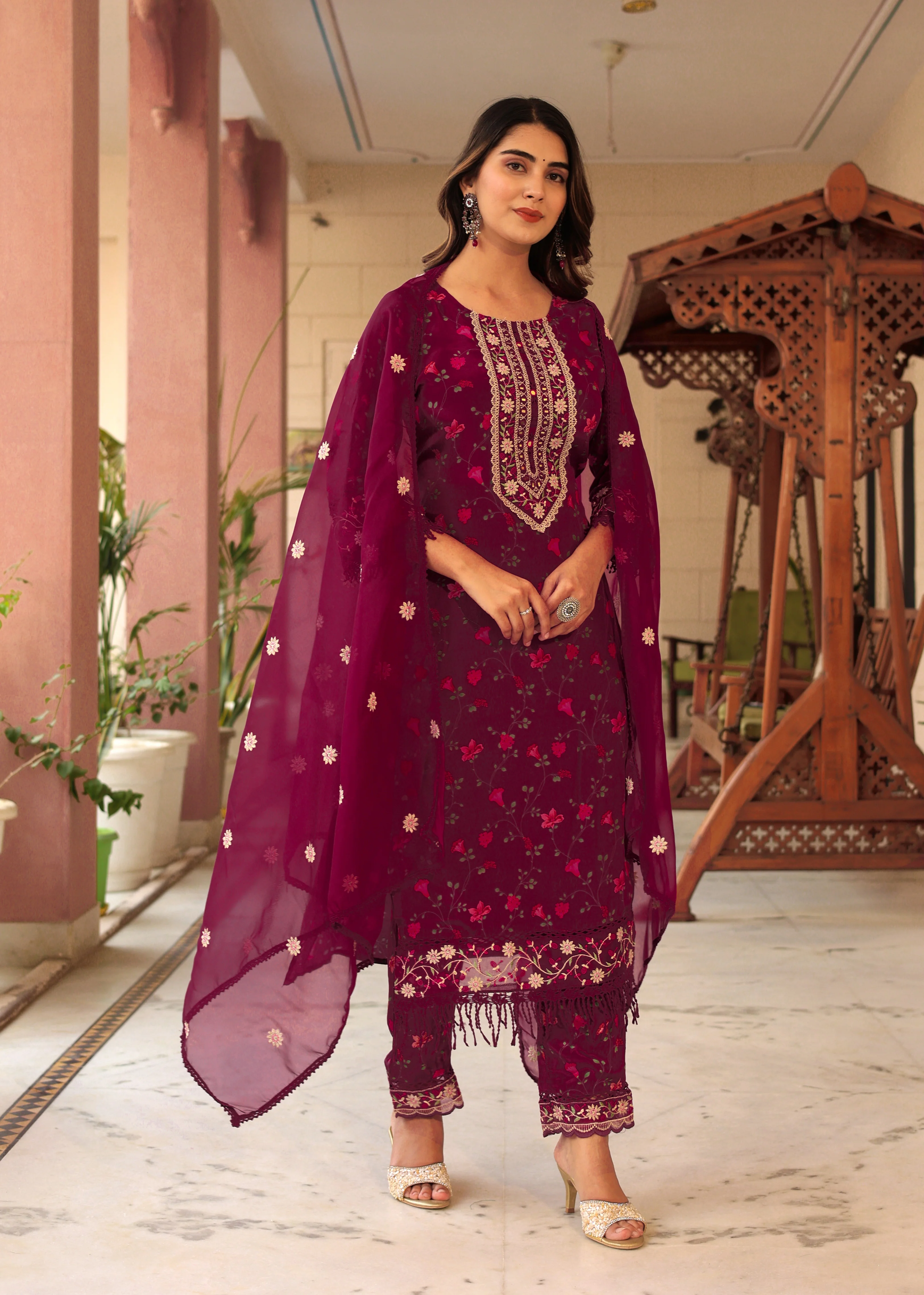 Wedding season special crepe heavy embroidered floral print pant set with embroidered organza dupatta This special set is elegant, timeless, and perfect for any wedding occasion. Its soft crepe fabric and intricate embroidery will make you stand out in style.