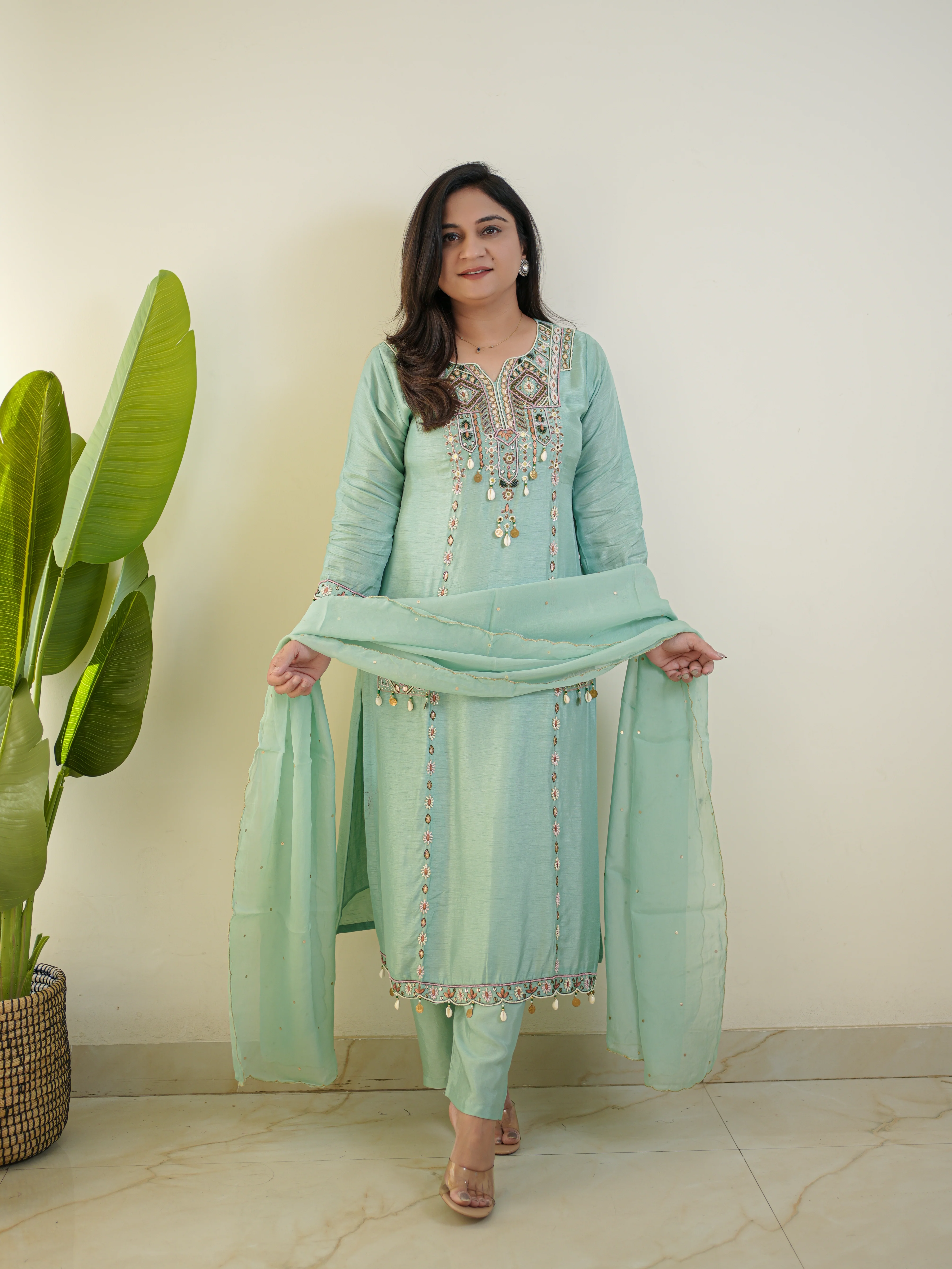 A masterpiece in luxurious Dola silk, this pant set is elevated with meticulous hand embroidery that adds a touch of finesse. Paired with a breathtaking Organza dupatta, it exudes an air of effortless sophistication.