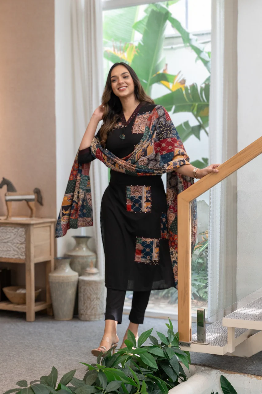Blue Zig Zag Cotton Pant Set with Appliqué work Dupatta This timeless ensemble features intricate Appliqué work, handcrafted by master weavers from India, for a stunning, one-of-a-kind look.
