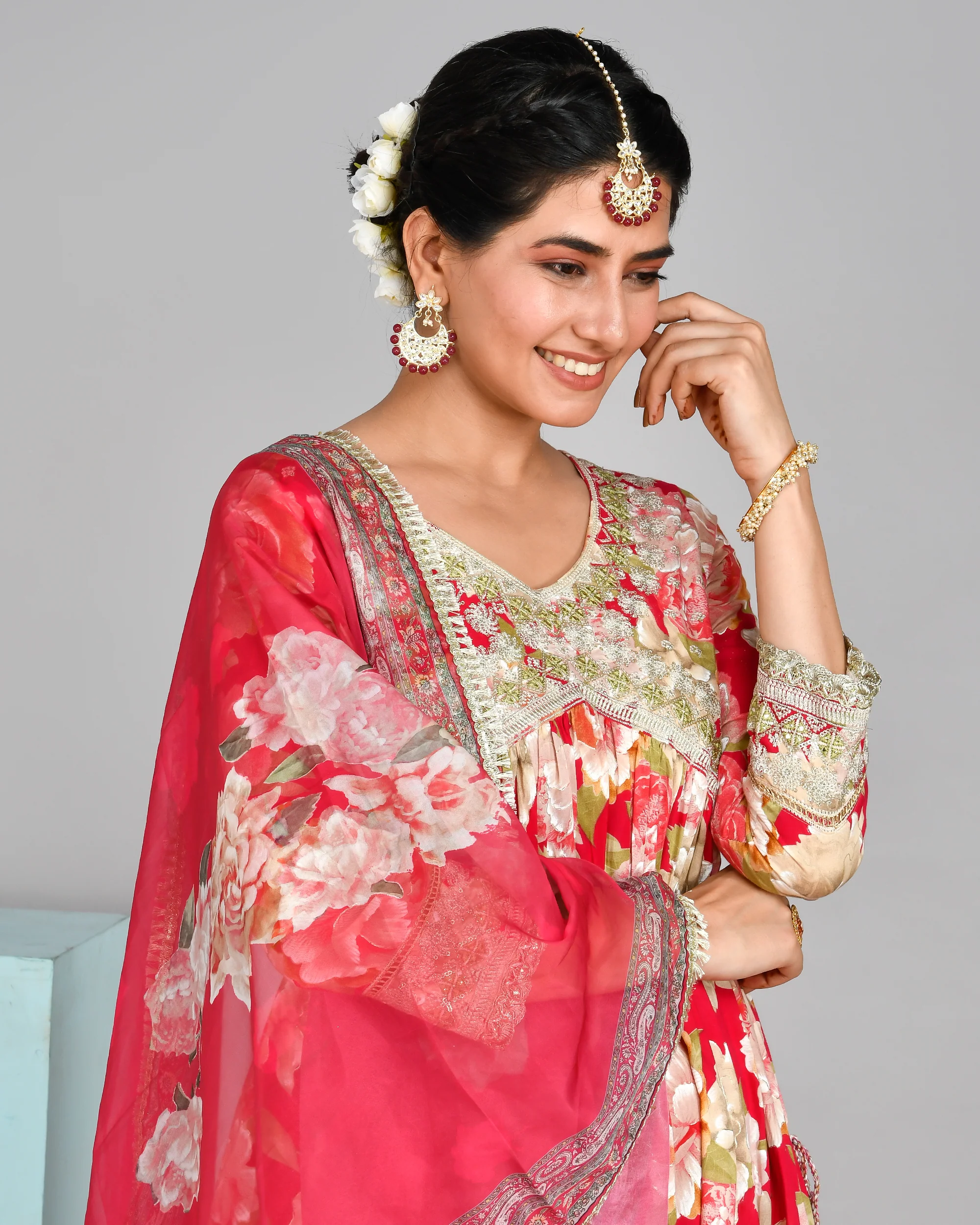 Dazzling in this party-ready, where traditional gota detailing meets popli accents. The digital organza dupatta is the cherry on top!