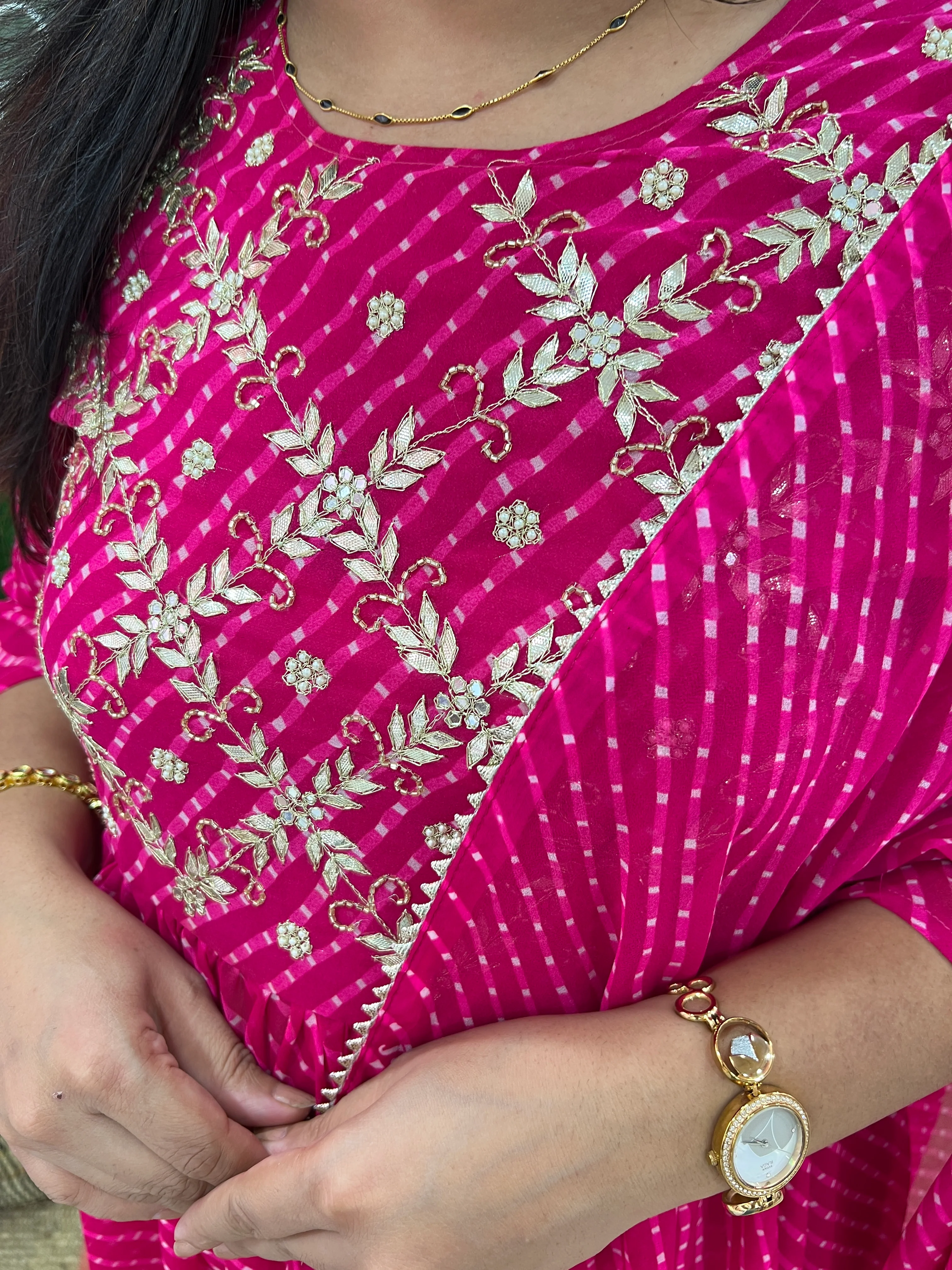 our Festive Special Leheriya Print Gotta Embroidery Nyra Pattern with Afghan Set – a true embodiment of cultural opulence and contemporary elegance. This ensemble is designed to make you the star of any festive occasion, showcasing the charm of Bandhani print and the intricacy of Gotta embroidery, all combined with the allure of Afghan-inspired design.