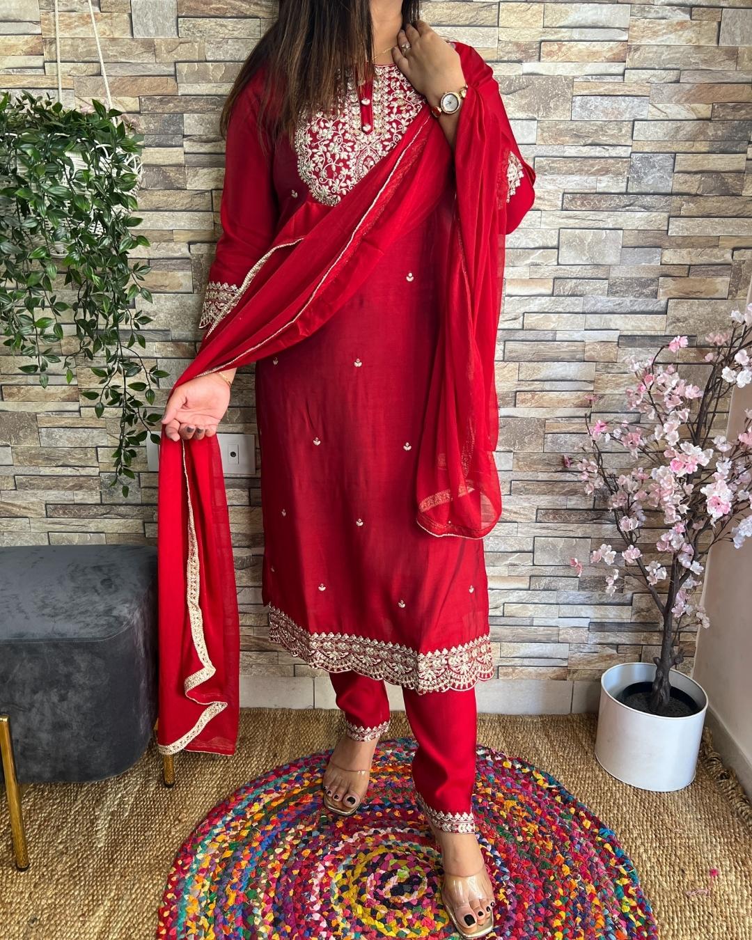 Elevate your style quotient with our pant-set, expertly tailored from luxurious muslin fabric. The kurta and pant come adorned with intricate Zari work, offering a shimmering homage to traditional artistry. Paired seamlessly with a light, flowing chiffon dupatta, this ensemble presents a harmonious blend of elegance and comfort. Ideal for those seeking to make a sophisticated statement, it's tradition and finesse woven into every thread.