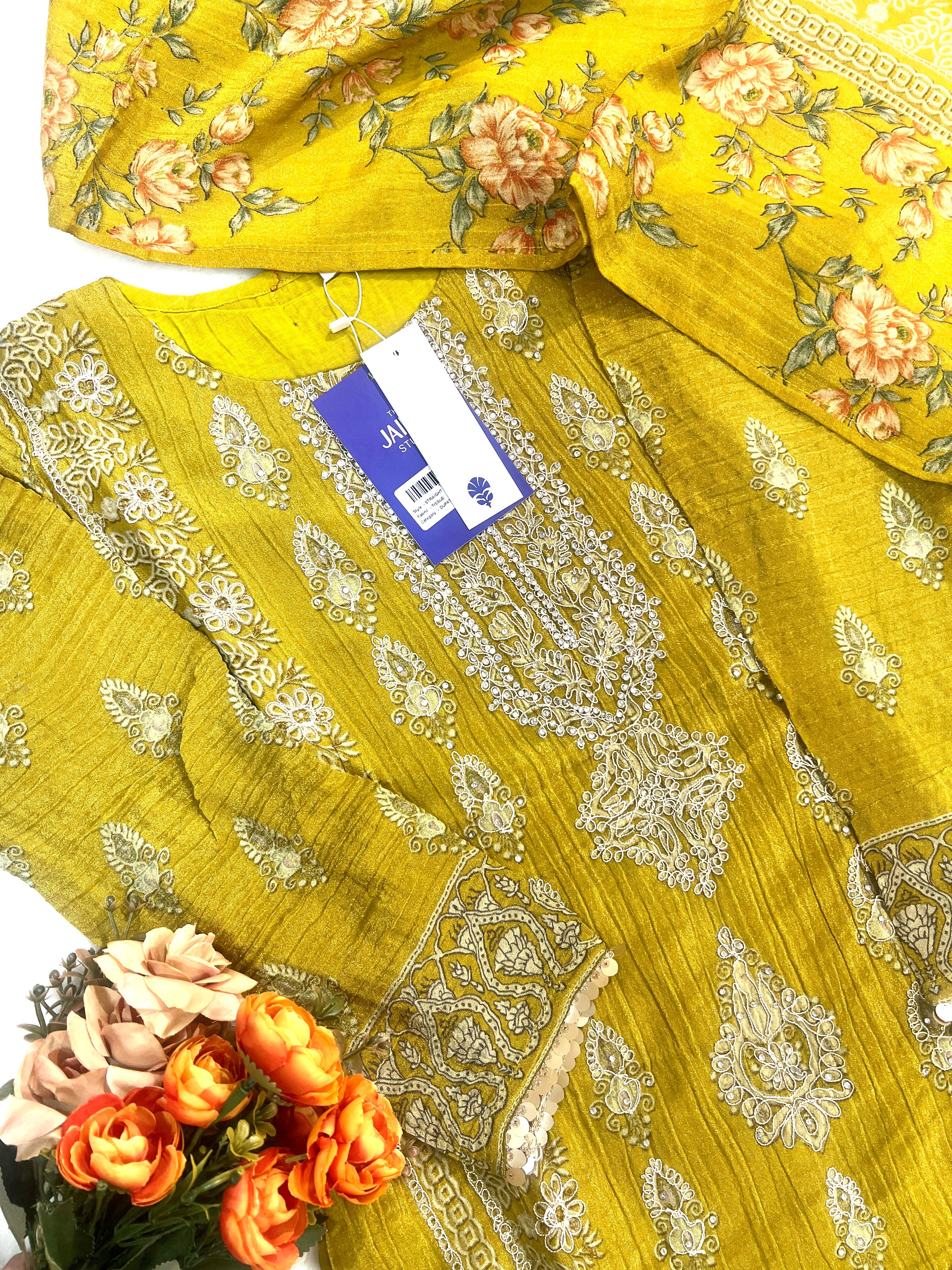 Upgrade your festival wardrobe with our stunning Tissue Shimmer Embroidered Pant set. The top features beautiful hand embroidery that will elevate your fashion game and make you the center of attention . Matched with a matching dupatta, this set combines luxury and traditional floral print for a show-stopping look.