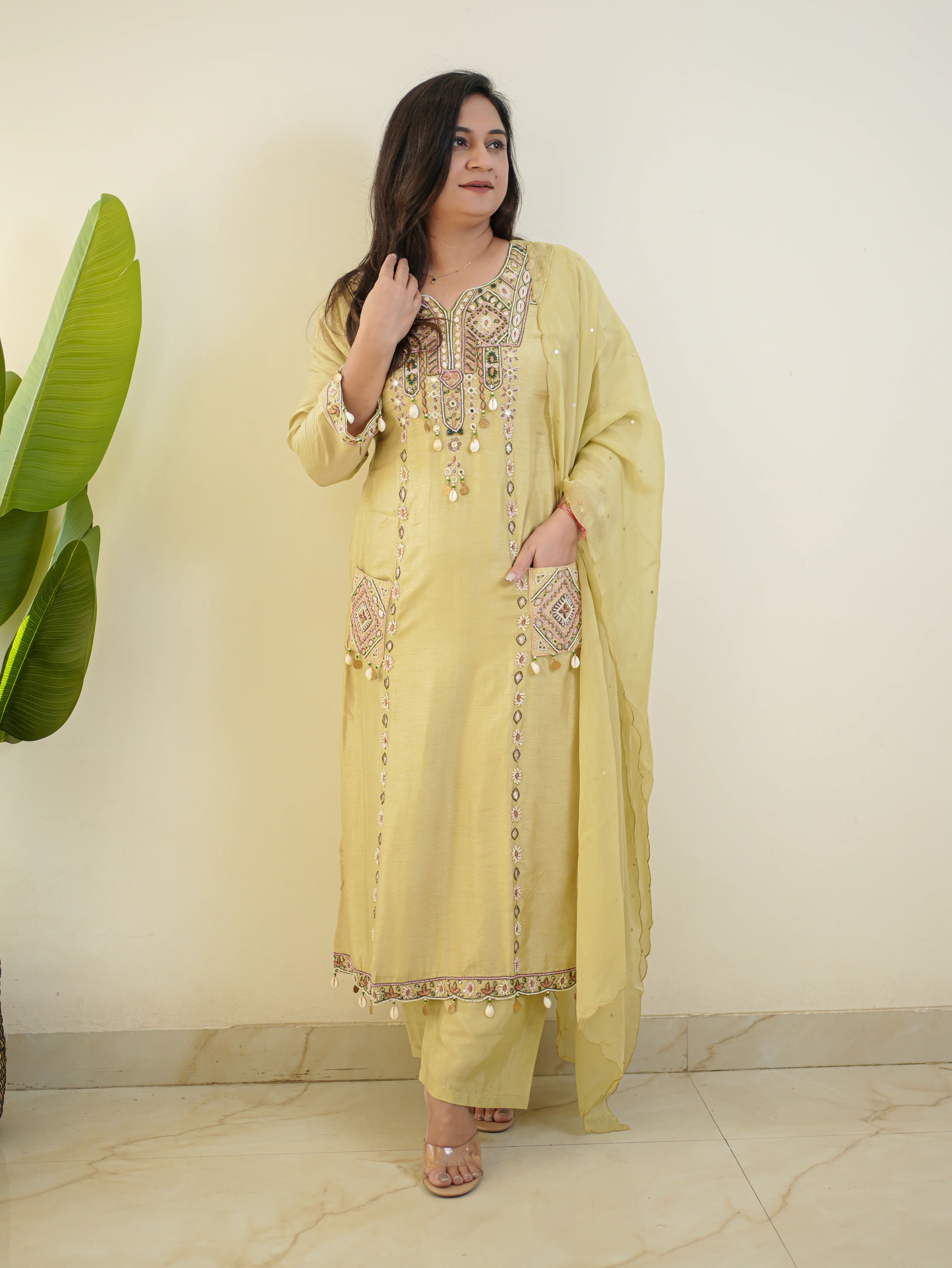 A masterpiece in luxurious Dola silk, this pant set is elevated with meticulous hand embroidery that adds a touch of finesse. Paired with a breathtaking Organza dupatta, it exudes an air of effortless sophistication.
